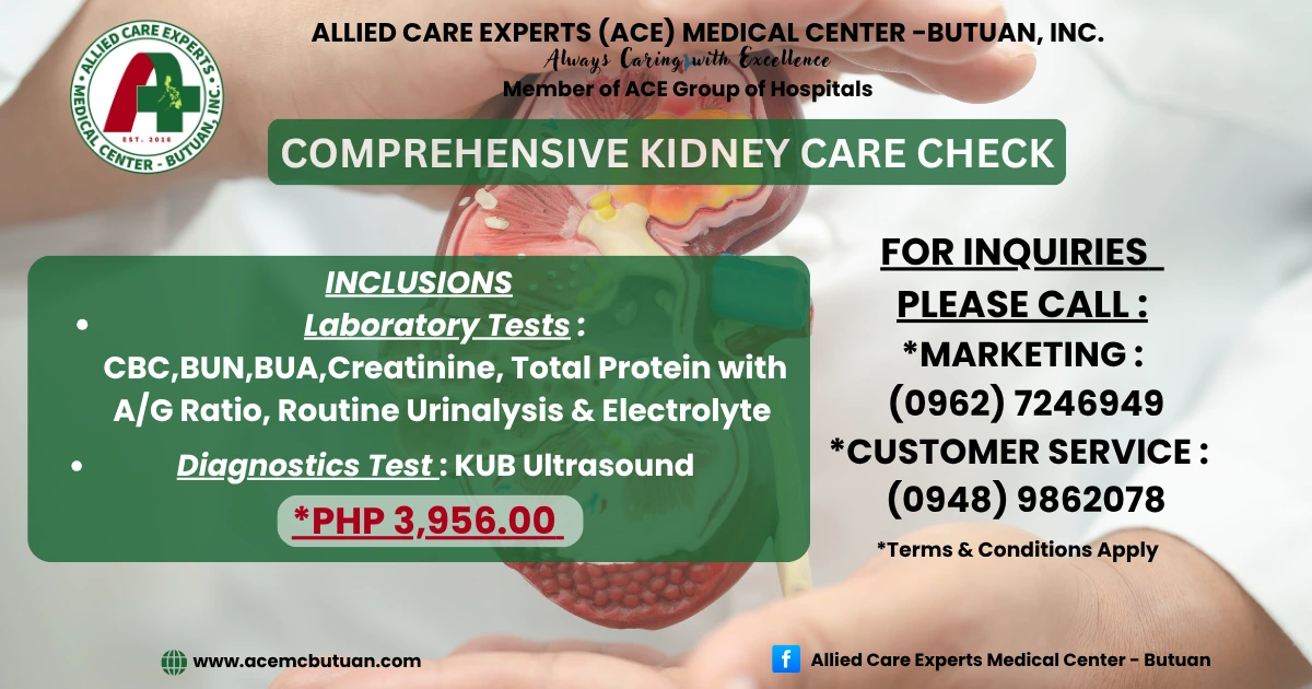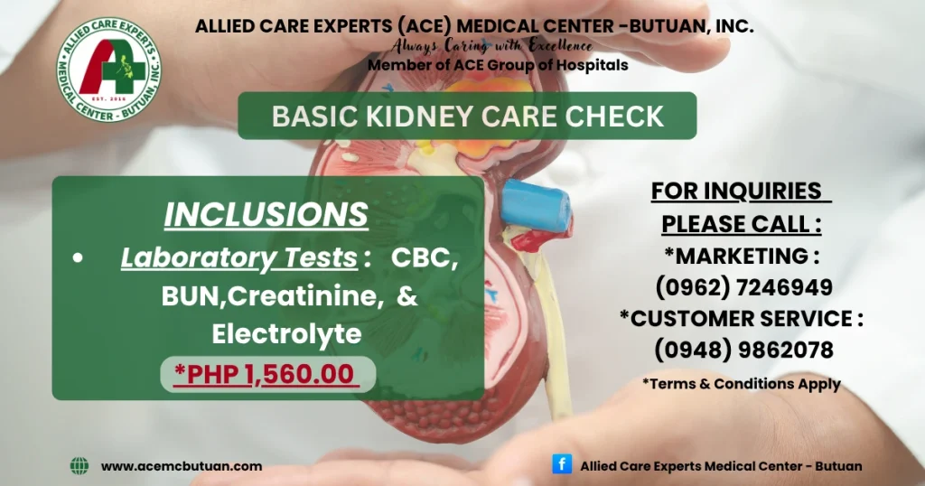 ACE Medical Center – Butuan now offers Kidney Care Packages designed to protect your body’s natural filters – because your health starts from within! ๐ฉบ
